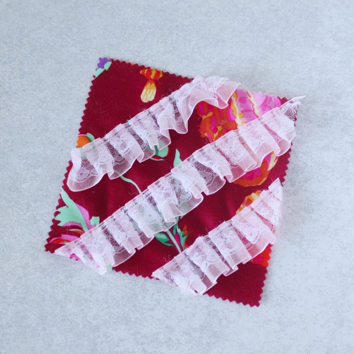 9. Make a lace square by pinning and stitching stripes of lace trim diagonally across another charm pack piece.