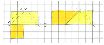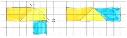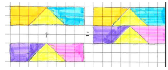 - On the Right side of the light rectangle, put right sides together with one of your Med/Dark rectangles. The Med/Dark rectangle will be placed at a 90-degree angle compared to the Light rectangle. Sew on your first line from the middle of the light rectangle towards the middle of the med/dark.
