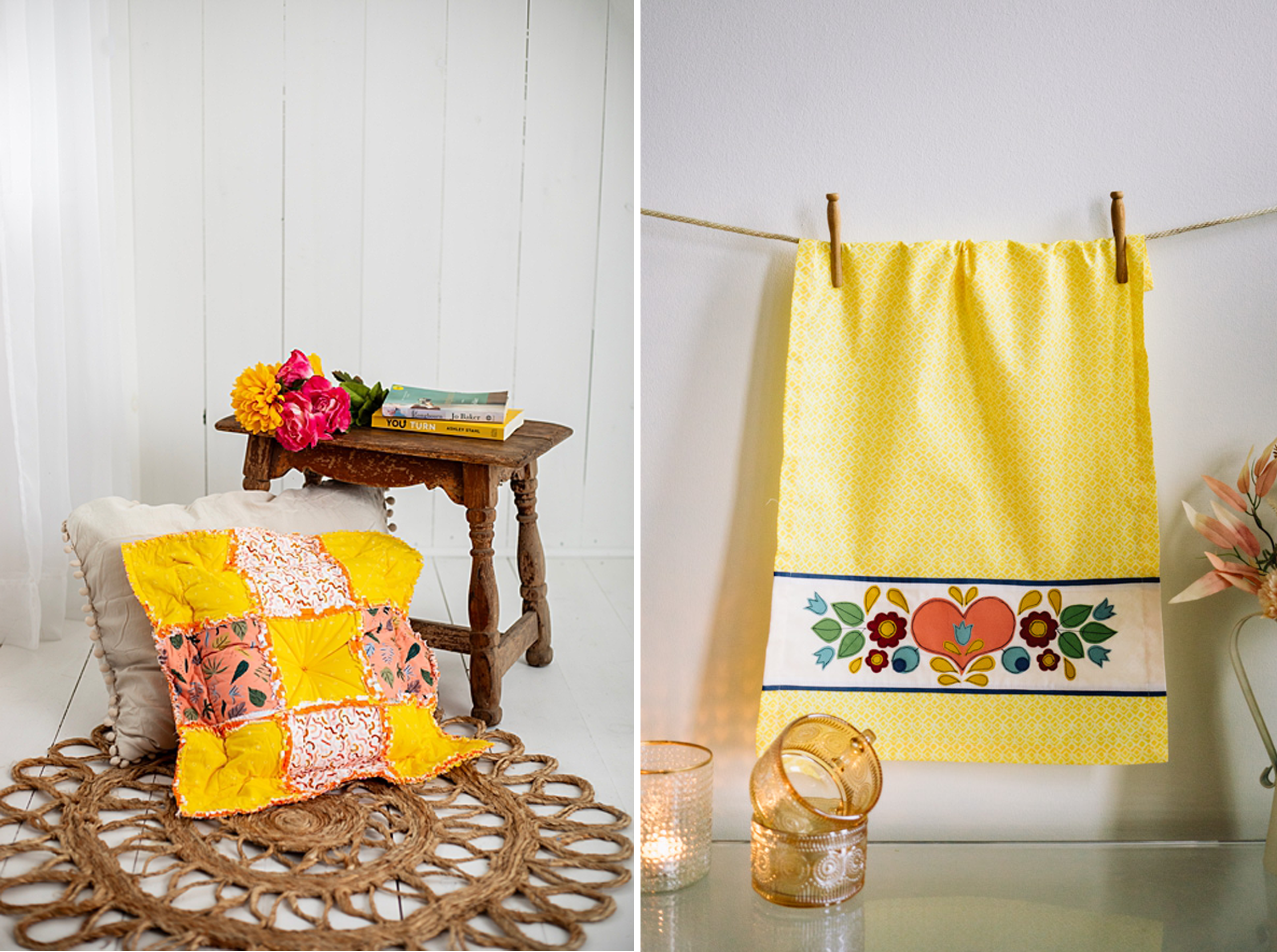 How about making a heartfelt housewarming gift (or something special just for you!)? Make our Sweet Folk Art Applique Tea Towel to give your kitchen some extra sparkle. The folk art pattern really pops on the white background, and the stitching style is stress-free. You may be able to find a lot of the fabrics for this project in your scrap stash.